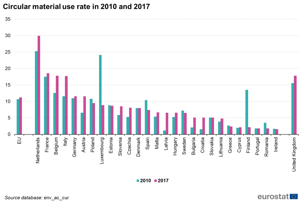 Sin embargo, un país como el nuestro con unas tasas aceptables en materia de Economía Circular cuando realizamos una comparativa con el resto de la economías Europeas, observamos que nuestro en modelo productivo desde el año 2010 al 2017 se han empeorado ratios relativos a la reutilización circular de materiales, que nos indican cuan eficientemente gestionamos nuestros recursos y cuan eficientemente hemos implementado programas de mejora.
