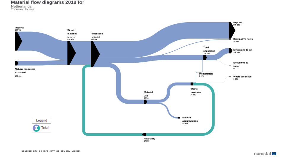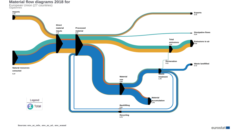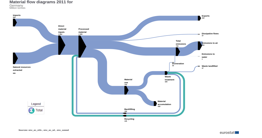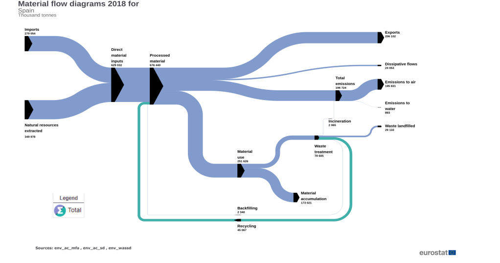 Pero como podemos estar completamente seguros de que estamos acertando con las estrategias planteadas, la economía circular no es solo una gestión eficiente de de los residuos generados en un país, eso son tan solo indicadores que nos pueden dar pistas de cuan bien o cuan mal, gestionamos nuestros recursos en nuestros procesos productivos. Pero que pasa en el interior de la sala de máquinas de la economía de un país, que pasa en los procesos productivos y que efecto tienen en los hábitos de consumo, en los procesos de consumo de los hogares y del cliente final. Esa es la pregunta que se trata de dar respuesta con la metodología de análisis de flujos de materiales, descubriendo cuales son las fortalezas y las debilidades del tejido productivo y el consumo en un país.