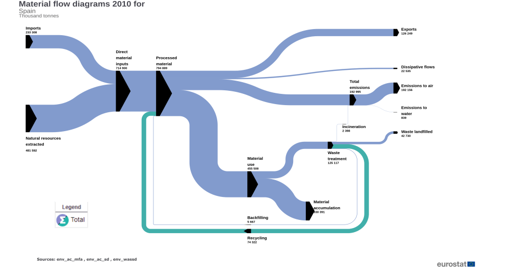 Una de estas metodologías de trabajo, es el análisis de flujos de materiales con los Diagramas de Sankey. Permitiéndose un análisis de los flujos de materiales a través del estudio de la economía de un país. En el ejemplo anterior a través del diagrama de Sankey es posible observar la progresión en el espacio del de la utilización de materiales utilizando como medida miles de toneladas, en sus entradas y salidas en los flujos productivos de la economía de un país, como España. Pudiéndose observar de una forma gráfica e intuitiva para poder extraer conclusiones acerca de la mejora en una dependencia de extracción de recursos naturales o un incremento considerable de las exportaciones, a pesar de parámetros susceptibles mejora como el incremento de volumen en el tratamiento de residuos, o incluso haber aumentado la emisiones.